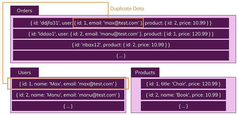 - Join이 존재하지 않고 데이터를 가져올 때, 컬렉션에 있는 데이터를 복제하여 필요한 데이터의 일부만 가져옴